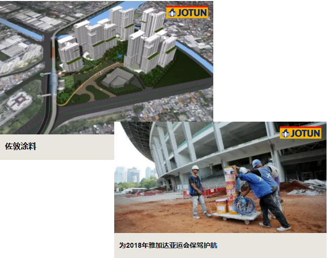 【概要描述】第十八屆亞運會將於2018年8月18日至2018年9月2日在印尼雅加達和巨港舉辦。來自45個參賽國約1萬名運動員將聚集以此,參加此次賽事。佐敦,以卓越的塗料產品、高性能的解決方案,為亞運會場館設施保駕護航!     此次中標項目包括格羅拉蓬卡諾國家體育場、10幢亞運村公寓大廈等亞運會設施。作為全球領先的塗料供應商,佐敦為此次亞運會設施提供包括裝飾漆、工業保護塗料、粉末塗料在內的"一站式解決方案"。
